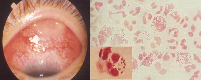 감염으로부터 24시간이내에 증상이 발생하는 시력을 위협하는 심각한 결막염으로 빠르게 진행하여 천공까지 일어나기 때문에 빠른 진단과 치료가 중요합니다. 대표적인 원인균은 임균이 가장 흔하고, 수막염균이 두번째로 흔하며 증상은 눈꺼풀부종, 심한충혈, 결막부종, 다량의 화농삼출물(황록색) 소견을 보이며 치료가 늦으면 수일내 각막천공이 일어나고 대부분의 세균결막염과 달리 압통동반한 귀앞림프젤비대 소견도 동반됩니다. 임균의 경우 신생아나 성적으로 왕성한 청년, 젊은 성인에서 발생가능하고 빠른 각막혼탁, 궤양, 각막천공을 보일수 있으며 전방축농, 홍채염, 눈꺼풀농양과 같은증상도 발생할 수 있습니다. 수막염균결막염의 경우 혈행성 뇌수막염이 같이 오는 경우도 있으므로 주의 해야합니다. 진단은 그람염색과 배양검사상 그람음성쌍알균을 발견하는 것이고 임균이 경우 성적 파트너, 신생아의 경우엔 산모도 함께 치료를 해야합니다. 치료는 빠르게 전신항생제 및 점안항생제 투여와 생리식염수세척이 필요합니다.