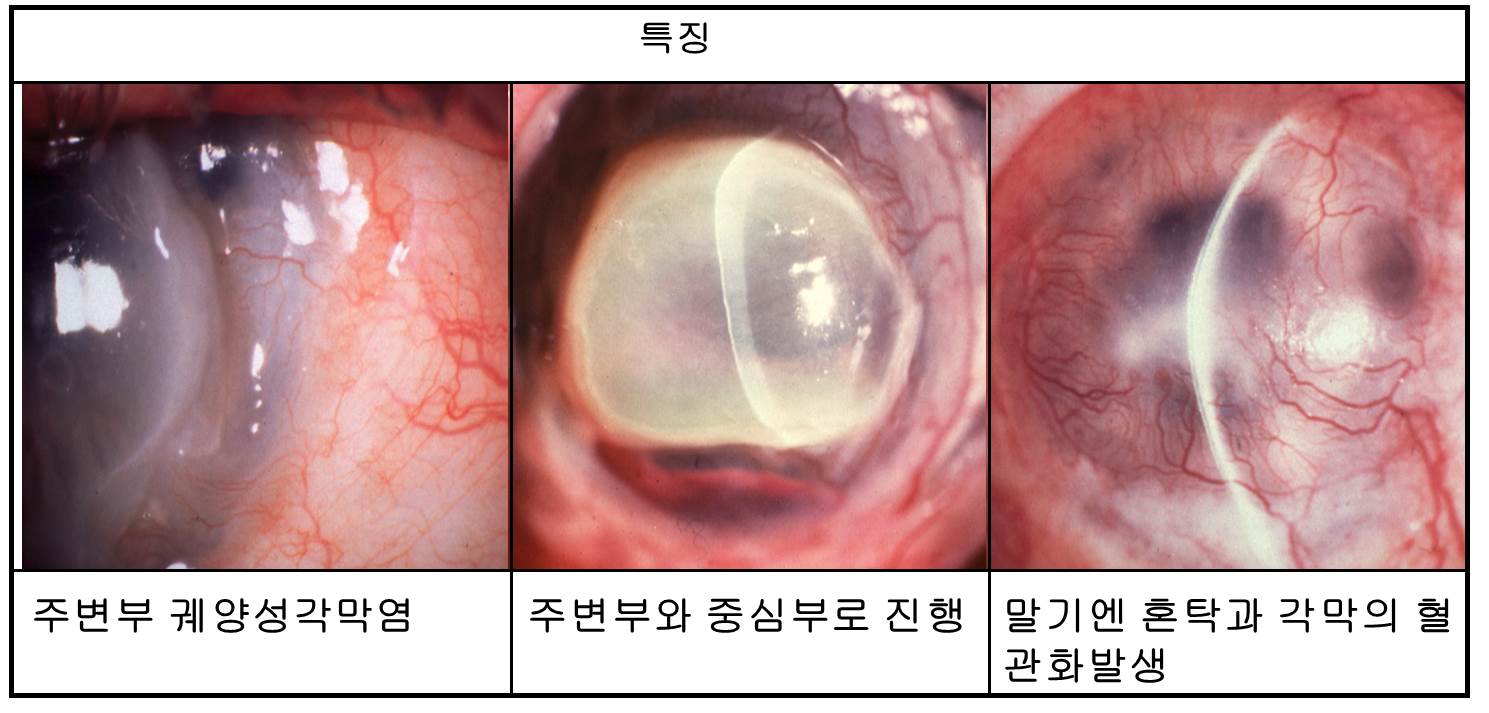 심한 통증을 동반한 초승달모양의 궤양으로 각막윤부(주변부)를 따라 윤부와 평행하게, 동시에 각막 중심부 방향으로 진행하는 주변 각막기질층의 만성염증입니다.