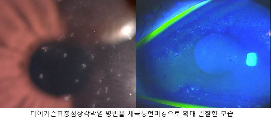 재발각막염의 병력, 다른각막질환이 없고 점안스테로이드에 잘 반응하는 비전형적인 상피병변을 보이는 경우 타이거슨표층점상각막염을 의심해봐야 합니다.