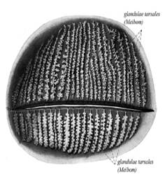 : 위눈꺼풀에 30-40개, 아래눈꺼풀에 20-30개 분포합니다. 마이봄샘의 배출구는 속눈썹의 후방, 피부점막경계부의 바로 앞에 위치합니다. 주머니 모양의 소염 30-40개가 합쳐저 1개의 주관을 이룹니다.