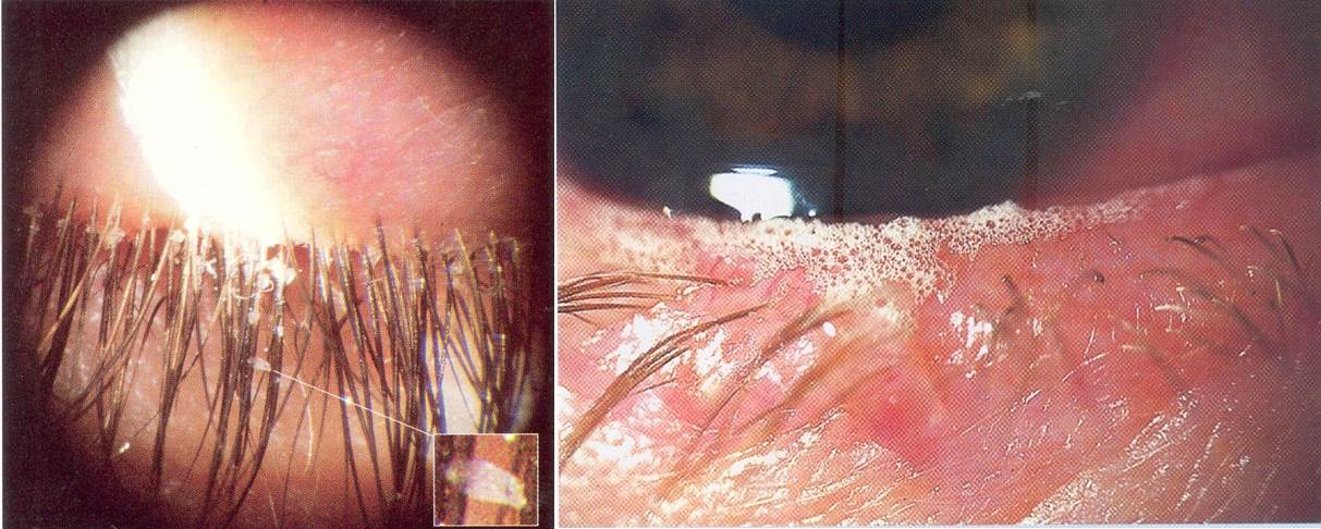 임상증상 : 만성적, 작열감, 가려움을 호소할 수 있고 대부분 노인에서 많이 발생합니다. 가피(비늘), 기름기 있는 눈꺼풀테와 눈물띠 내에 거품양상이 보이며 지루성피부염과 흔히 동반되있고 전반적인 피지샘의 기능이상으로 발생합니다