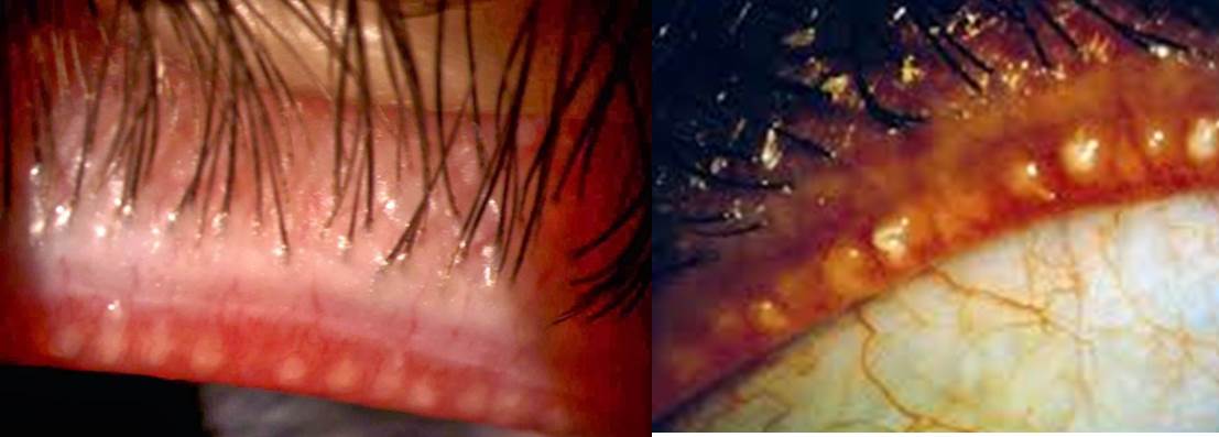 증상 : 안구건조증 증상, 이물감, 작열감, 통증, 가려움증, 충혈 등을 호소할 수 있고 지루성눈꺼풀염보다 증상이 심하고 각막염도 자주 동반됩니다. 누르면 치약 같은 분비물이 나오고 각막하측에 점상상피결손 소견을 보일 수 있습니다. 눈물의 부족과 잘 동반되며 눈물의 증발증가와 더불어 심한 안구건조증상을 호소합니다. 딸기코를 흔히 동반합니다. 눈물분비감소, 눈구석에서 눈물내 거품 등을 보이며 나이가 들수록 더 높은 빈도로 발생하고 노화현상으로 인한 눈꺼풀의 변화로 이차적인 비정상적인 눈깜빡임에 의해 발생할 수 있습니다.