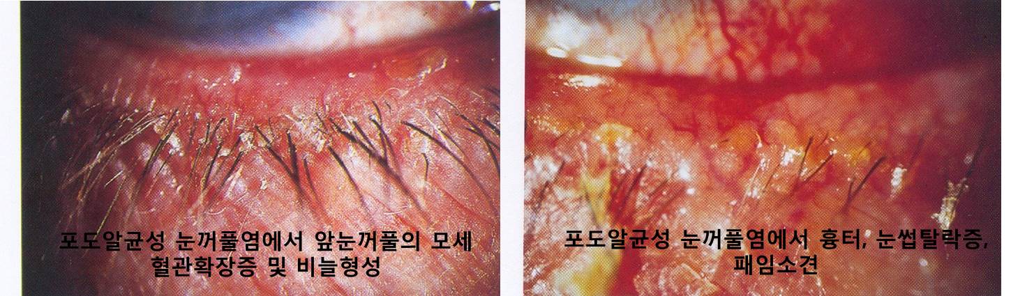임상증상 : 이물감, 통증, 건조증, 충혈 등의 증상이 악화와 완화가 반복되고 오전에 포도알균 균주양 증가하여 증상 악화가 됩니다. 포도알균이 속눈썹을 따라 존재하고 모세혈관확장, 눈썹탈락증, 백모증, 궤양, 점상 상피진무름, 각막염이 각막 하부 1/3에 발생할 수 있고 포도알균성가장자리각막염을 일으킬 수 있습니다. 젊은나이, 여성에서 흔합니다.