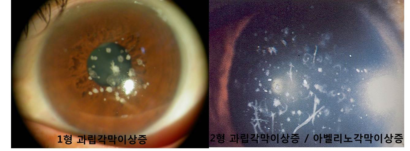 1형 (TGFBI형)과 2형 (gelsolin)으로 나눌 수 있으며 1형은 각막이상만 보이는 반면 2형은 각막뿐아니라 전신에 아밀로이드증 소견을 보입니다.