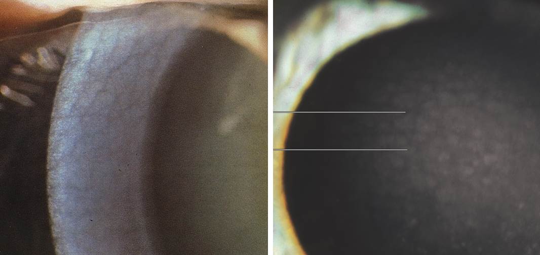 악어피부처러 보이는 각막의 모자이크 양상으로 육면체 혼탁을 보입니다. 대개 각막의 앞쪽 또는 뒤쪽에서 대개 양측성입니다. 앞, 뒤 유형 모두 가운데가 희고 투명한 형태의 회색, 다각형 혼탁을 보입니다.
