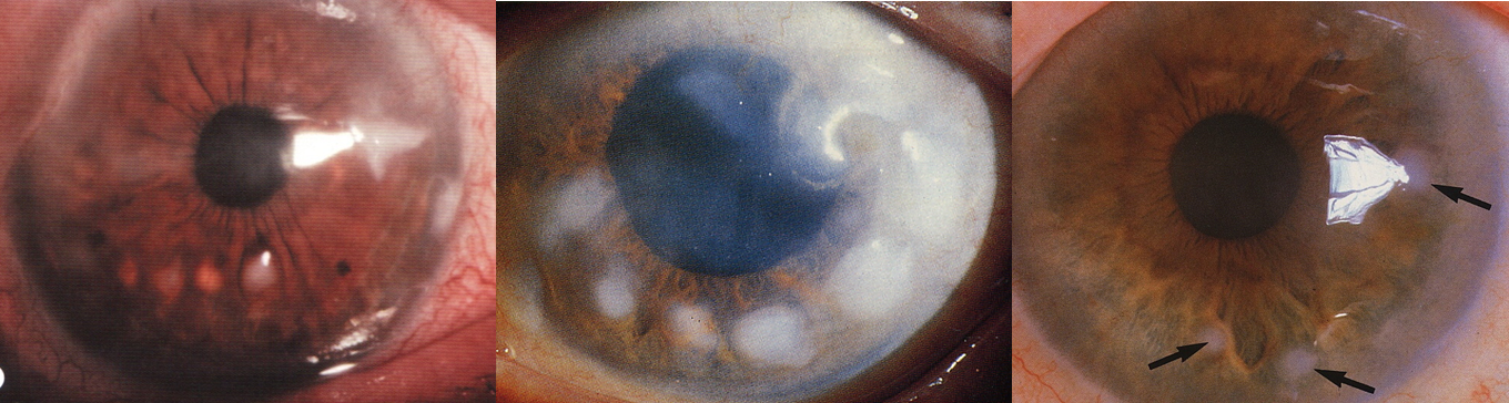 증상 : 결절은 흰색, 표재성이지만 심부기질을 침범하기도 하고 임상적으로 사라지지 않고 커질수 있으며 자극감이나 시력저하를 일으킬수 있습니다.