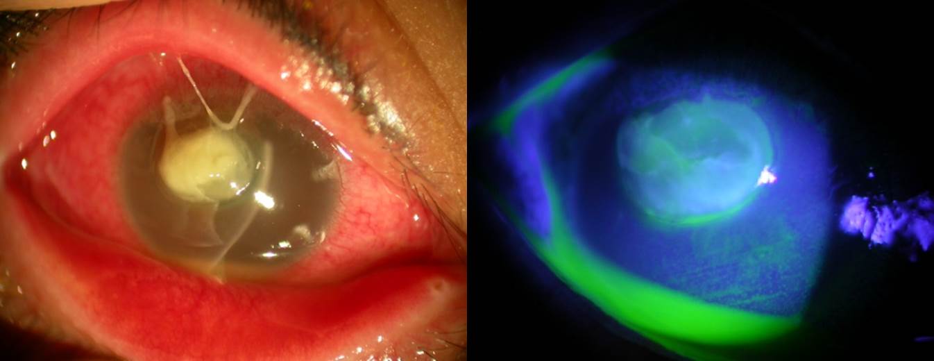 증상은 심한 통증과 충혈, 이물감, 눈물흘림, 눈부심, 눈뜨기힘든 증상이 나타날 수 있습니다. 진행속도는 감염을 일으킨 세균의 독성과 숙주의 방어기전에 따라 다른데 주로 빠른 진행을 보이는 균은 녹농균, 폐렴구균, 임균이 있고 중심부 각막에 각막염 발생시 치료가 되더라도 중심부에 혼탁이 남기때문에 시력저하가 영구저으로 남을수 있고 독성이 강한 원인균의 경우 24시간 이내 각막이 천공될 수 도 있으므로 빠른 진단과 치료가 중요합니다.
