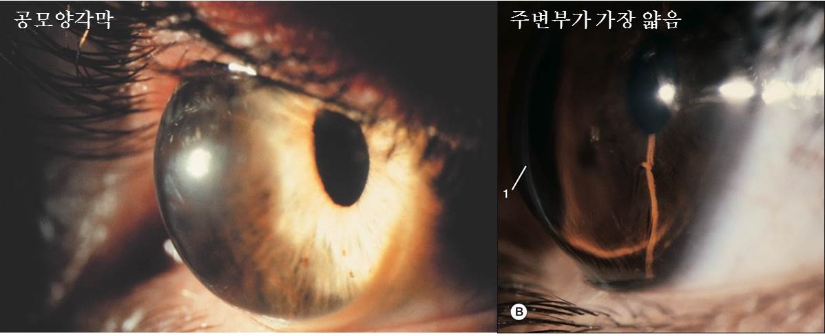 각막 전체가 얇아져 각막이 전체적으로 돌출되어 공모양 같고 특히 주변 각막이 가장 얇습니다. 공막의 얇아짐도 동반이 가능합니다. 각막직경은 정상이거나 약간 증가되어 있고 미세한 각막반흔은 나타날 수 있으나 철환은 없습니다.