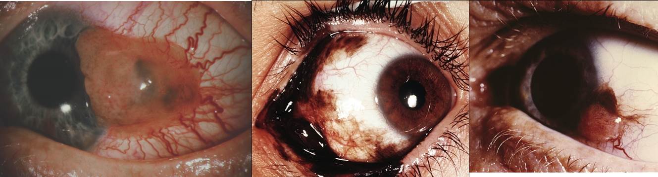 임상양상 : 단일성, 검거나 회색빛/분홍색 결절이 혈관과 동반되어 있고 공막에 고정되어 있어 움직이지 않습니다. 원래의 병변에 따라 모양은 매우 다양합니다. 초기에는 수평으로 자라고 이어 급속히 수직방향으로 침범하는 양상을 보입니다. 각막, 안와, 주위 림프선으로 전이가능합니다. 사망률은 8~26% 정도 입니다.