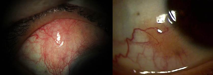 시력은 대개 영향을 받지 않고 눈부심, 염증이 있 부위에 국한된 압통이 동반되도 하고 심한 경우 결막이나 눈꺼풀이 붓는 경우도 있습니다. 각막은 보통 침범하지 않으나 아주 드물게 침범하면 눈물흘림, 눈부심, 일시적 시력저하가 동반될 수 있습니다. 결막의 충혈은 붉은색, 구불구불하게 보이는 표층 상공막 모세혈관망이 충혈되어 있지만 정상적인 형태를 유지합니다.