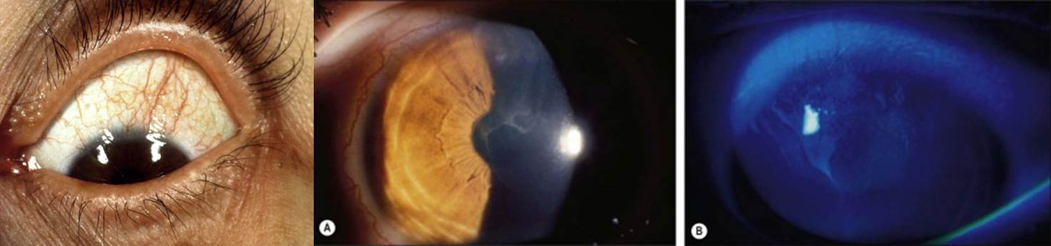 - 상각막에 수평방향으로 엷은 형광염색을 보이는 흰색의 선으로 나타나고 윤부와 병변 사이의 상피는 정상입니다.