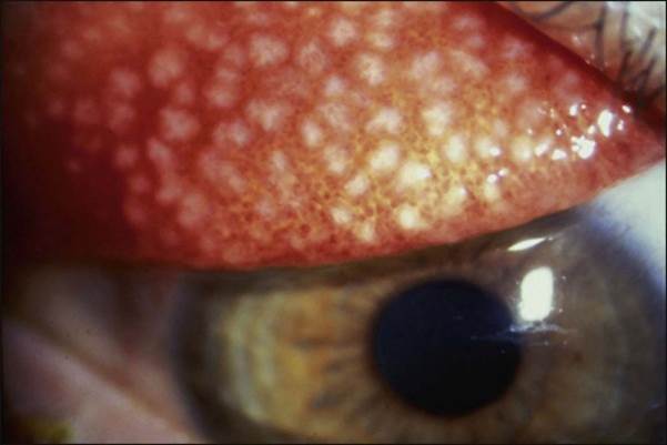 - 증상 : 위안구결막의 충혈과 비후, 상각막상피의 침범, 넓은 부위의 결막병변, 소판누스 관찰, 이물감, 눈물흘림, 눈부심, 작열감 가려움, 불규칙한 상피나 점상각막염에 의한 시력저하를 호소할 수 있습니다.