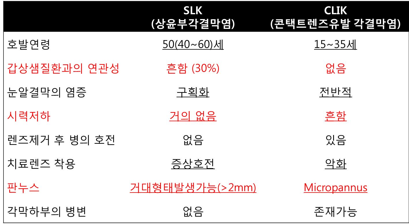 - 원인 : 보존용액에 대한 민감성 혹은 독성반응이나 부분적인 윤부줄기세포결핍, 과도한 렌즈 움직임 등