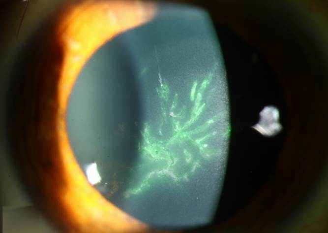각막상피각막염은 실제 바이러스가 활성화되서 살아있는 상태로 소수포-> 가지모양 궤양(사진) -> 지도모양궤양(사진) -> 흉터 순으로 진행이되며 통증과 눈부심, 눈물, 시력감소와 같은 증상이 발생합니다. 또한 각막의 감각도 소실되거나 줄어들어 궤양정도에 비해서는 세균각막염보다 통증은 덜할수 있습니다. 치료는 감염상피를 제거하고 항바이러스제 안약을 점안해야하며 2-3주간 점안해야합니다. 스테로이드는 바이러스 활성을 증가시킬 수 있기 때문에 감염상피각막염에서는 사용하지 않는게 좋습니다.